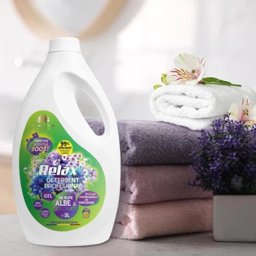 Inspirat de către cel mai îndrăgit detergent din lume din perspectiva persistenței parfumului și îmbunătățit cu tehnologia unică în România ”Timeless Aroma Boost”! Descoperă noul tău aliat și cel mai bun prieten al hainelor curate, catifelate și parfumate: Relax!